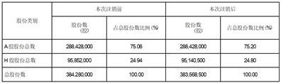 2023年6月15日,公司已在H股股份过户登记处卓佳证券登记有限公司办理完成已回购的711,500股H股股份的刊开头续。本次刊出后,公司的总股本将由384,280,000 股变更为383,568,500股。公司将尽快办理相干工商变更登记手续。